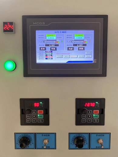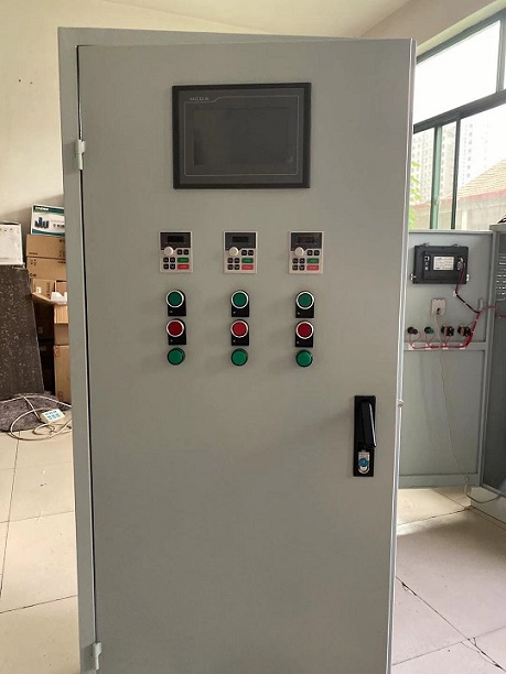PLC觸摸屏變頻控制柜中包括裝置本體,裝置本體的頂部設(shè)置有頂板,頂板采用軟塑鋼材料制成的,其表面涂有防腐蝕涂料,裝置本體的正面設(shè)置有柜門,柜門表面安裝有液晶觸控屏,液晶觸控屏采用電容屏幕制成,PLC控制器與觸摸顯示屏相連接,傳感器安裝在供水管路上,變頻器與供水泵組相連接。 液晶觸控屏的底部設(shè)置有若干控制按鍵,控制按鍵與裝置本體信號相連接,裝置本體的底部設(shè)置有底板,底板的下部安裝有減震裝置,減震裝置的底部設(shè)置有底座,裝置本體的右側(cè)面裝設(shè)了警報燈,警報燈和裝置本體的信號相連接,裝置的本體里部裝設(shè)了若干掛板,掛板與裝置本體無縫焊接,掛板表面預(yù)留有若干掛鉤孔, 該PLC觸摸屏變頻控制柜控制方便,安全性能越高,通過PLC可以支持遠(yuǎn)程控制,使用效率越高,使設(shè)備運行流程及運行狀況簡潔明了、形象直觀,各功能模塊及報警情況一目了然,方便使用和檢修,節(jié)能效果越加顯明。