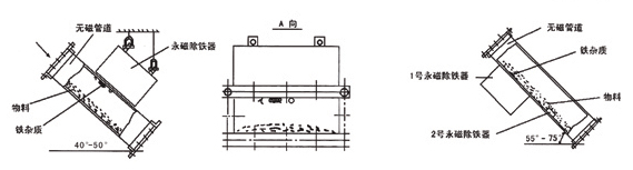 RCYA1、RCYA2系列管道永磁除鐵器包括無磁管道和永磁鐵兩部分,專用于封閉管道內(nèi)非磁性物料的除鐵,永磁除鐵器內(nèi)部采用高性能稀土強磁材料組成復(fù)合磁系。具有體積小、磁力大、重量輕、除鐵干凈、方便、無能耗、使用壽命長等特點。適合沒有輸送皮帶,只能提供下料溜槽的場合。當(dāng)散狀物料經(jīng)過時,鐵雜物被高場強的永磁鐵吸附,清除鐵雜質(zhì)時,打開管道專用門將雜質(zhì)取除。該設(shè)備適用于含鐵量較少的場合,主要應(yīng)用于水泥、化工、煤炭、塑料、耐火材料、建材等行業(yè)的下料管道中清除雜質(zhì)。